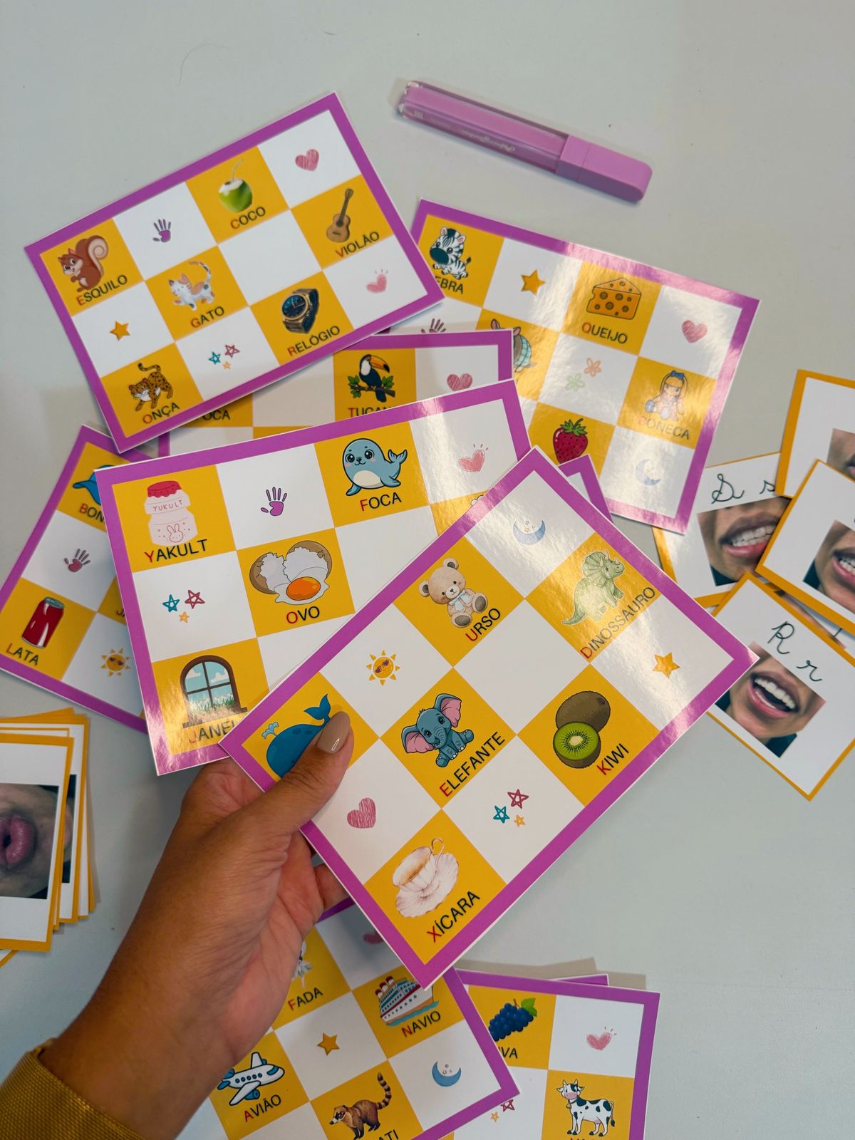 26 cartas com o alfabeto fônico (para o professor cantar o bingo)